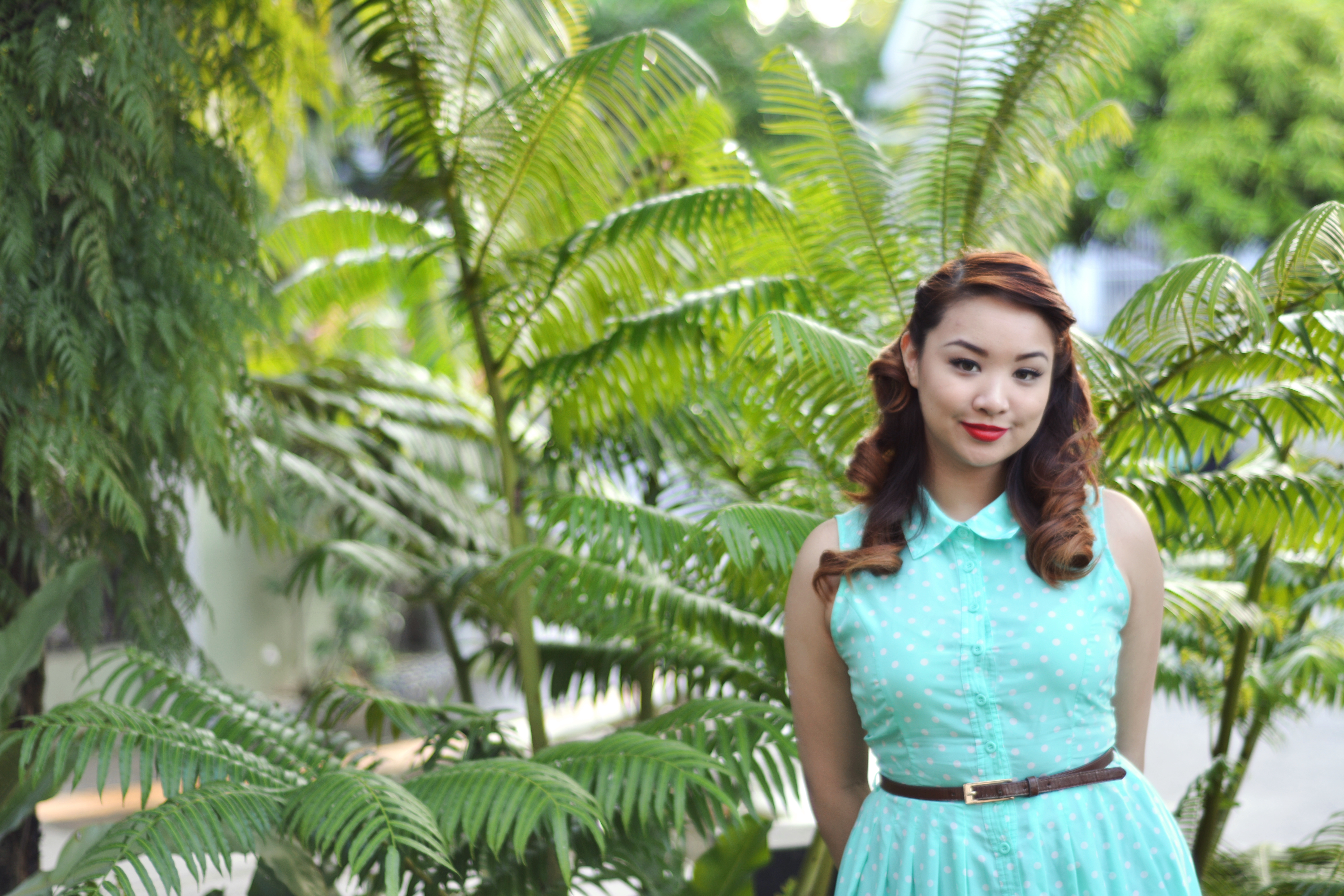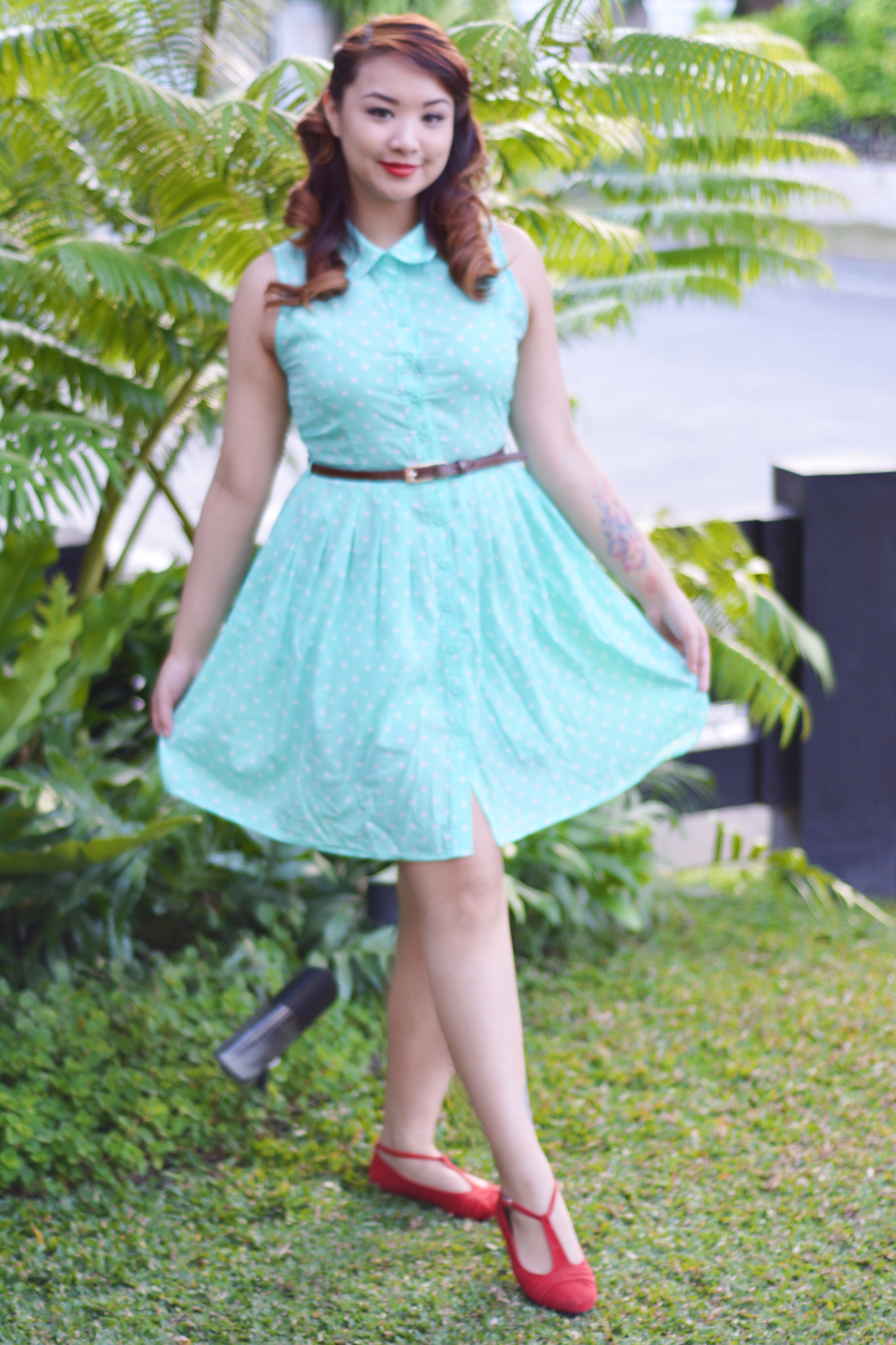 I think I’m having an affair with the color teal. This dress is so cute with it’s polkadots and the structure of the color makes it a classic pinup look. The material is so light which is perfect for summer. My shoes are Philippine hand-made and guess for how much? Just Php 250! I did my makeup light for the day because of the insane humidity that is happening. This look is overall pretty simple.