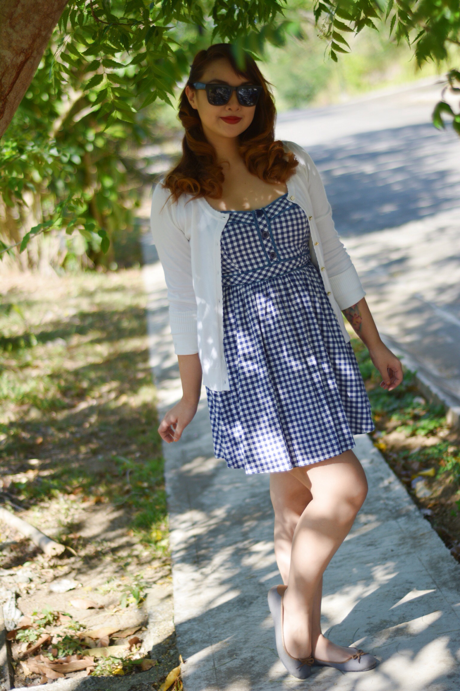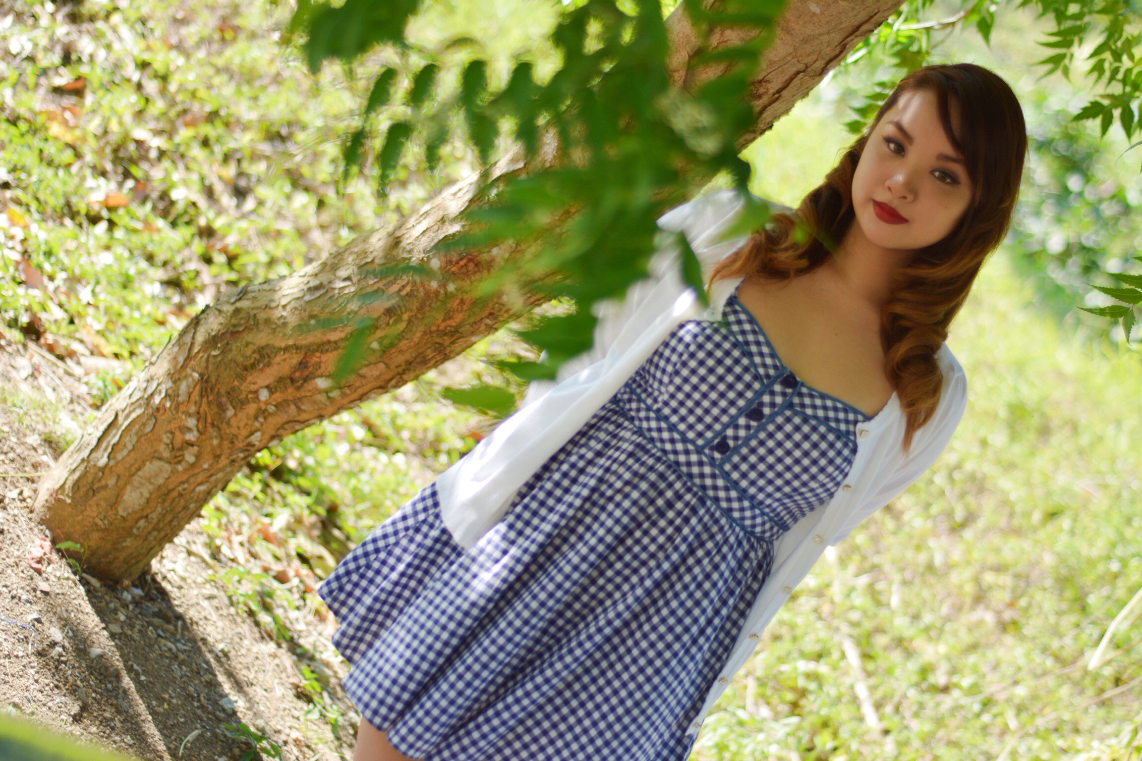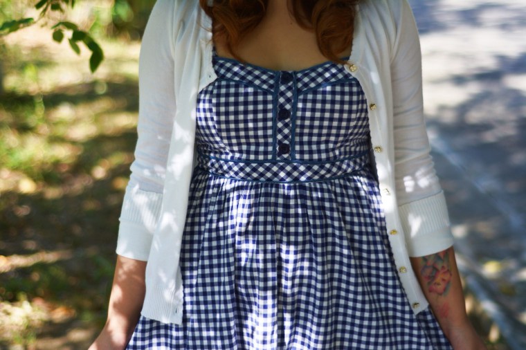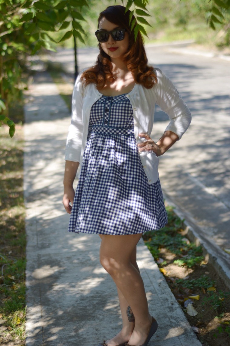 Gingham is one of my favorite pinup prints, and with my white cardigan this outfit is perfect for a hot summers date.