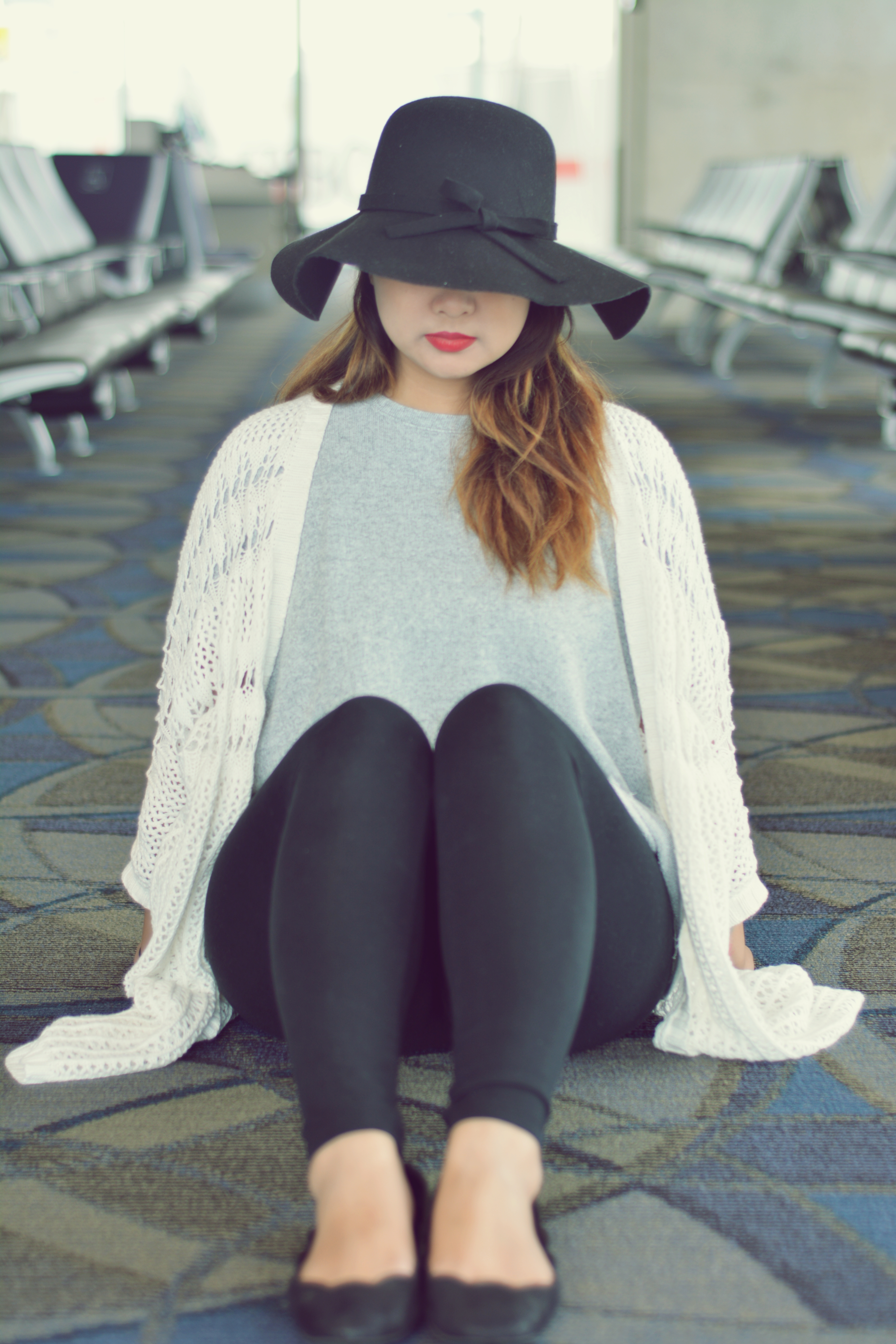 Not the most stylish, but definietly the most comfortable. Leggings, an oversized shirt, a light layer (mines a knit) and easy slip-off flats which are important when going through airport security. No accessories please. Just a hat to hide the terrible airplane hair upon landing.